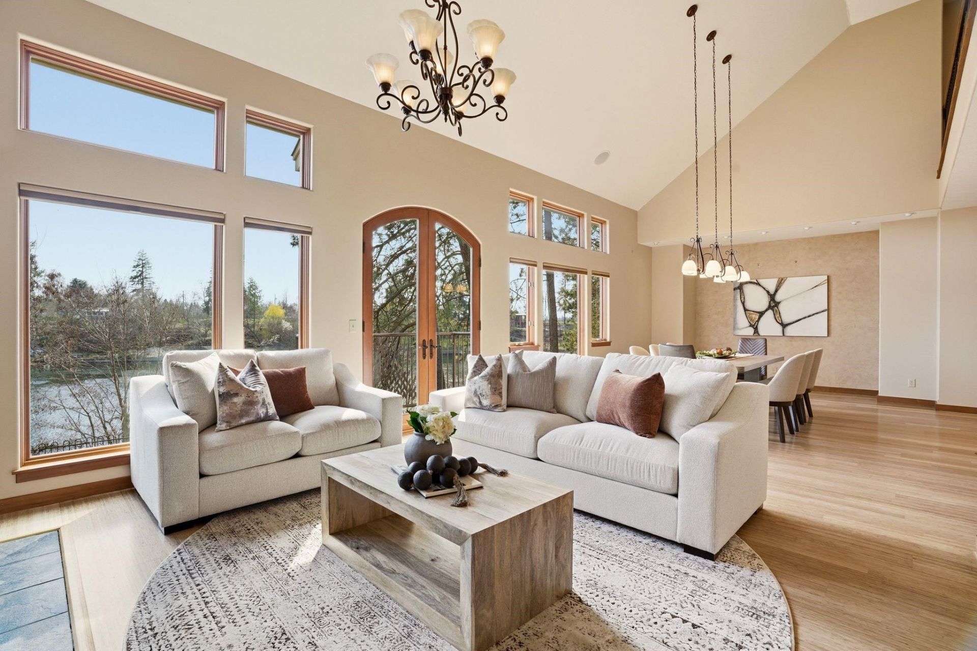 Tucked along 270 of private Spokane riverfront, this exceptional estate offers rare seclusion just minutes from town. The 5,102 sq ft home features 4 bedrooms and 3 baths, with a stunning kitchen designed to follow the natural curve of the river. Expansive windows in the great room and dining area frame peaceful water views, while newly refinished bamboo floors add warmth and style. The upper level is a private primary suite with walk-in closet, laundry, library, and bell tower room. The daylight walk-out lower level includes a fully equipped 2-bedroom apartment with kitchen and laundry, ideal for guests or multigenerational living. The property also features a 240 sq ft cottage, grape arbor, established perennial fruit plants, raised garden beds, and an oversized garage with a plumbed shop that has a vacuum and air compressor system. A rare blend of privacy, character, and riverfront luxury.